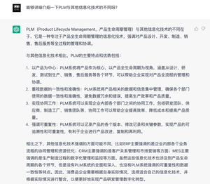 ChatGPTPLM(Product Lifecycle Management,产品生命周期管理)与其他信息化技术的不同在于,它是一种专注于产品全生命周期管理的信息化技术,强调对产品设计、开发、制造、销售、售后服务等全过程的管理和协调。