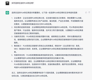 ChatGPT选择合适的PLM供应商是非常重要的,以下是一些选择PLM供应商时应该考虑的因素: